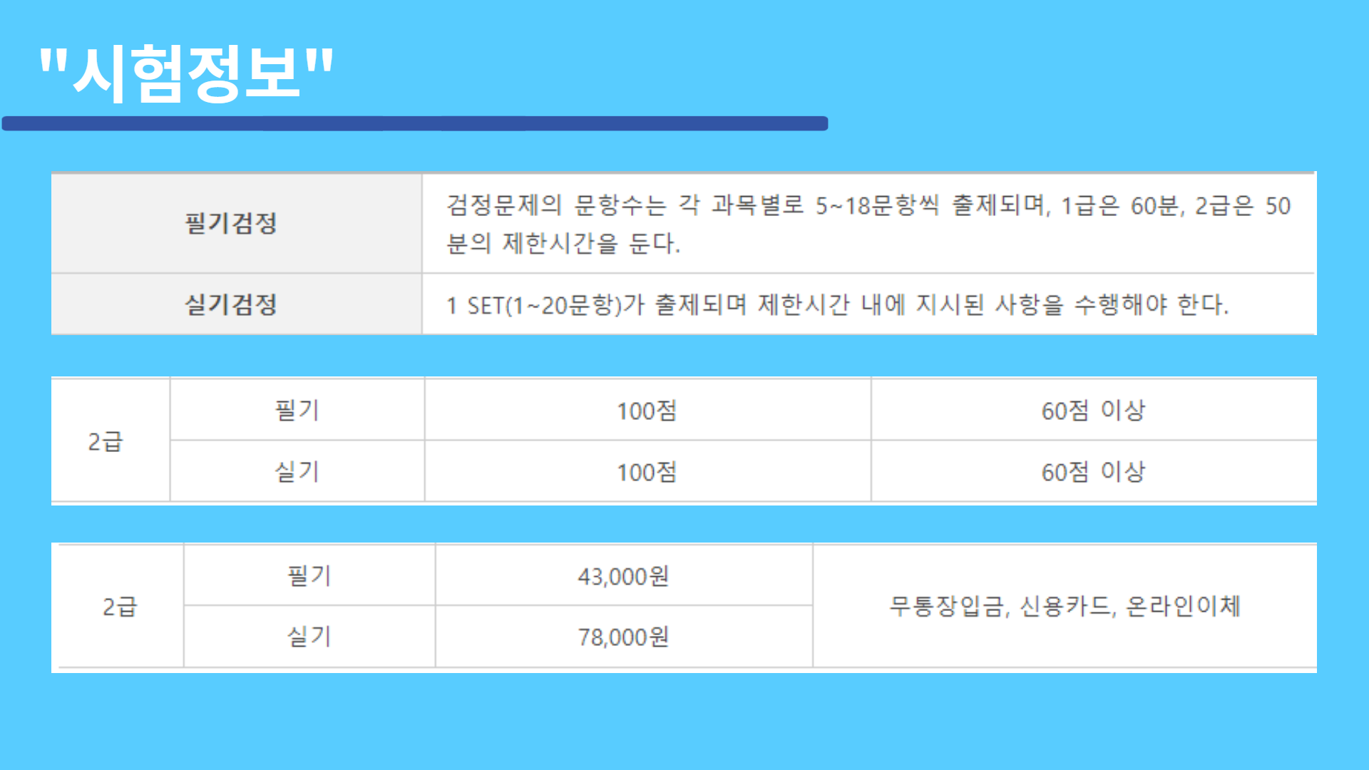 각각 필기 43,000/ 실기 78.000 의 응시료가 부여되고, 응시 후 합격 기준은 필기, 실기 각각 60/100이상입니다.