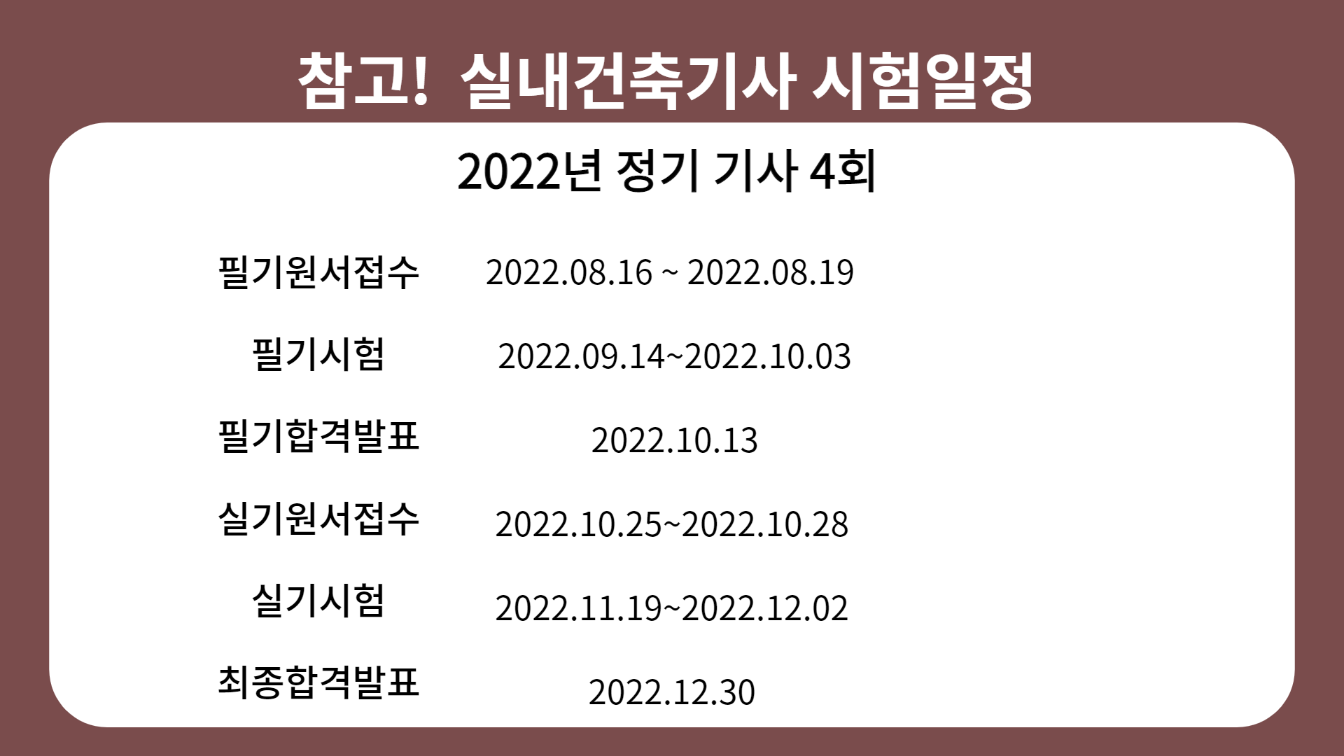 실내건축기사 필기원서접수, 필기시험, 합격예정자 발표, 실기원서접수, 최종합격발표까지!