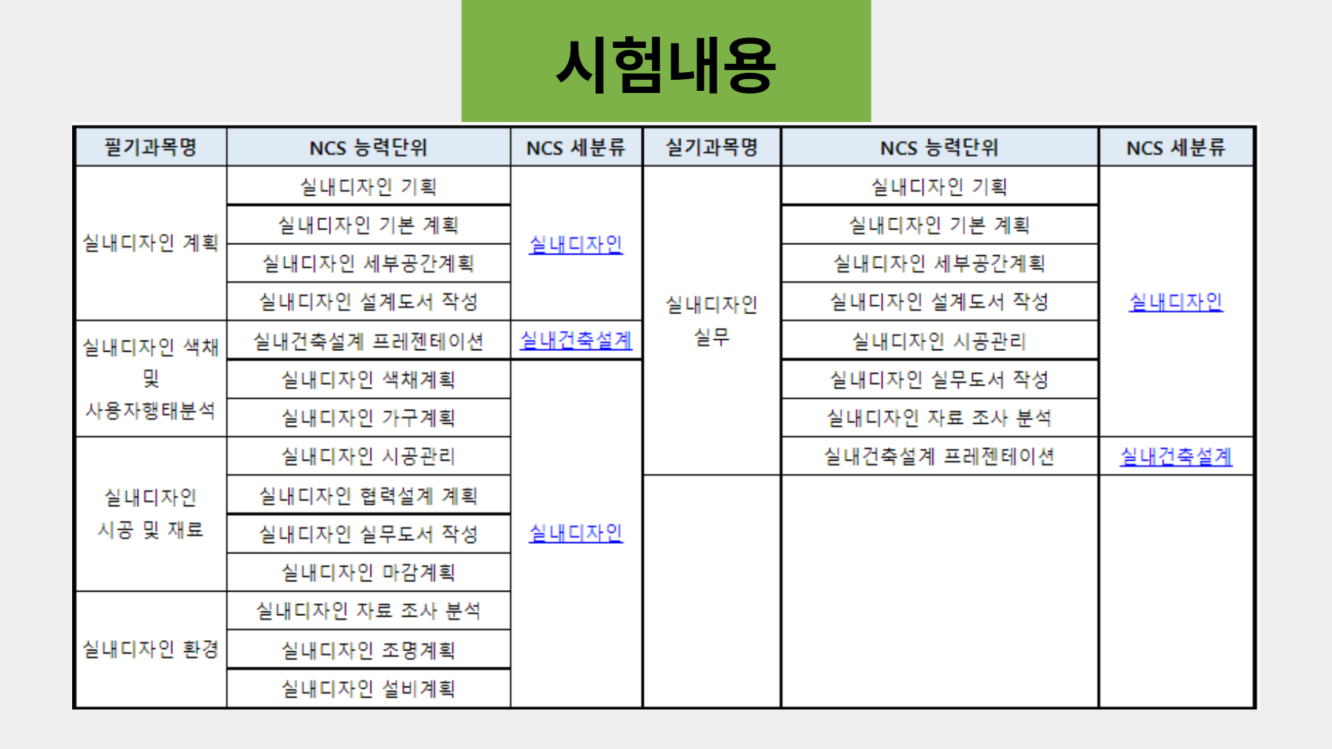 필기에서 실내디자인 계획, 색채 및 사용자 행태분석, 시공 및 재료, 환경에 대해 다루고