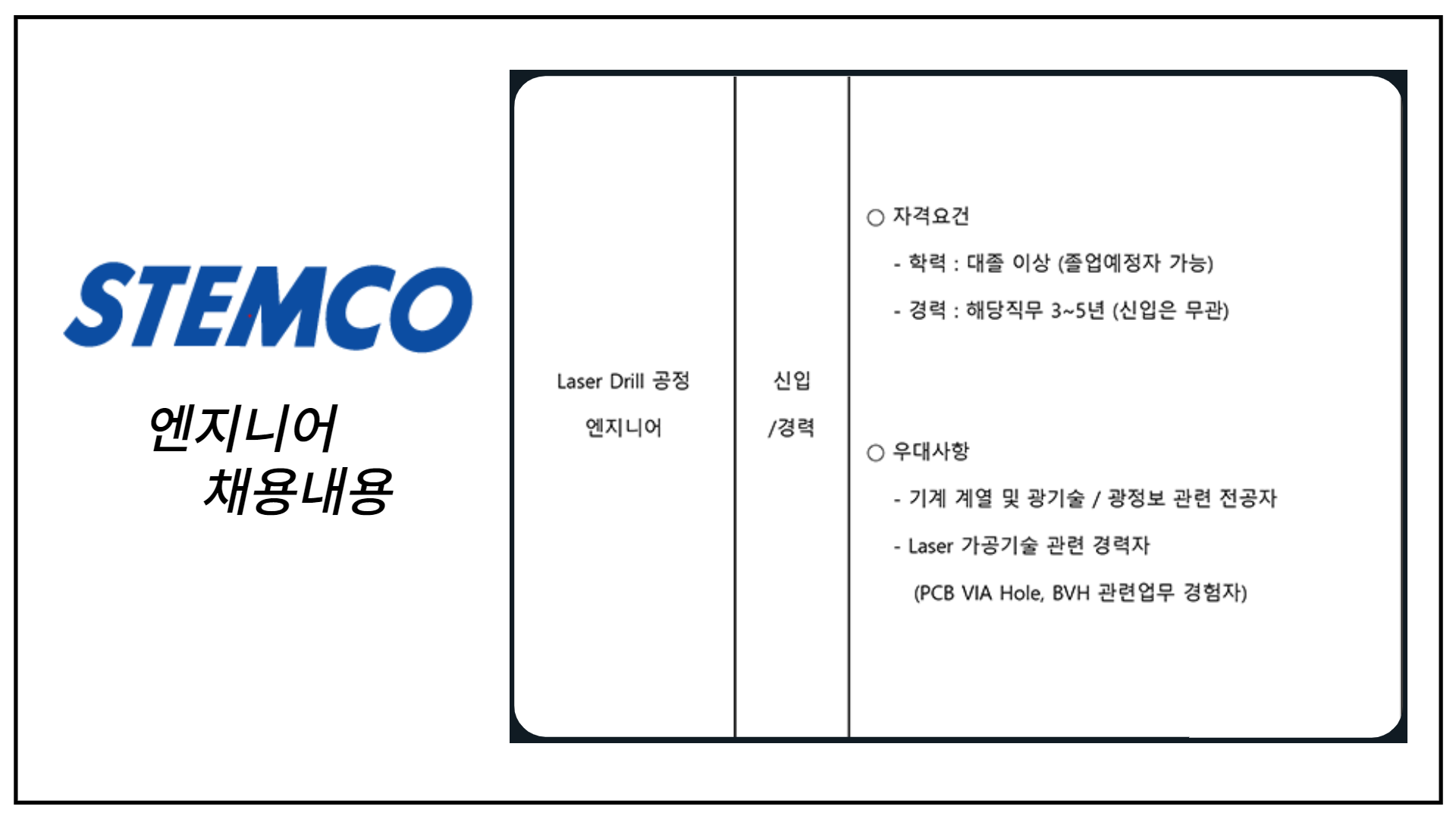 스템코에서 Laser Drill 공정엔지니어 채용 진행을 앞두고 있는데요,