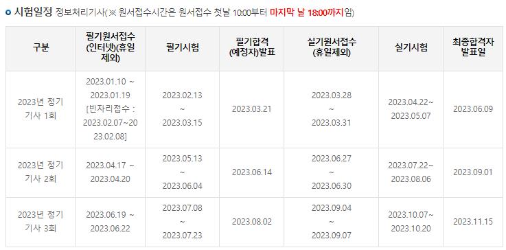 정보처리기사 시험 일정은 2023년에 3회 시행되며 시험 일자는 상단의 사진을 참고해 주시면 되겠습니다.