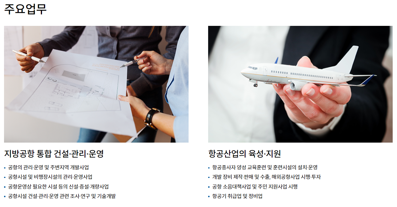 주요업무는 지방공항 통합 건설과 관리 운영으로