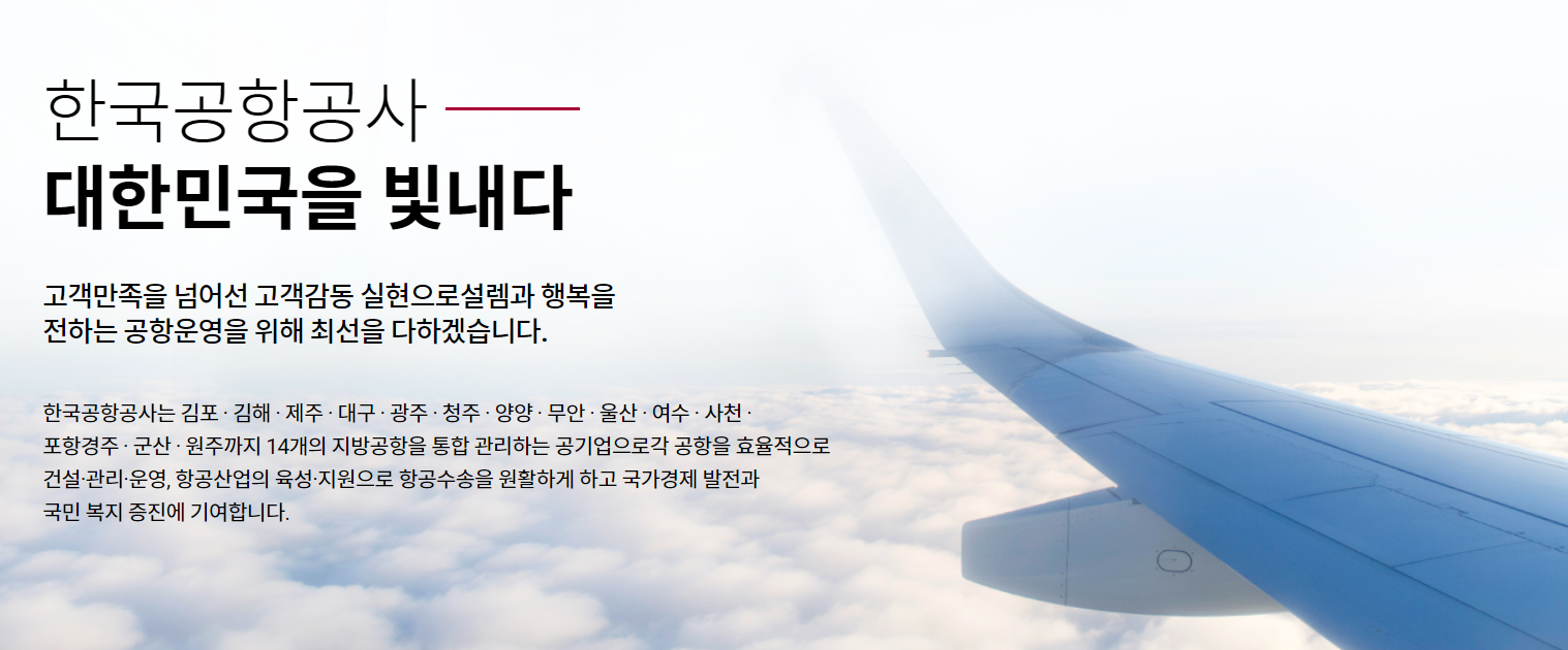 항공산업의 육성 및 지원하여 항공수송을 원활하게 하고 국가경제 발전과 국민 복지 증진에 기여하는 기업입니다.