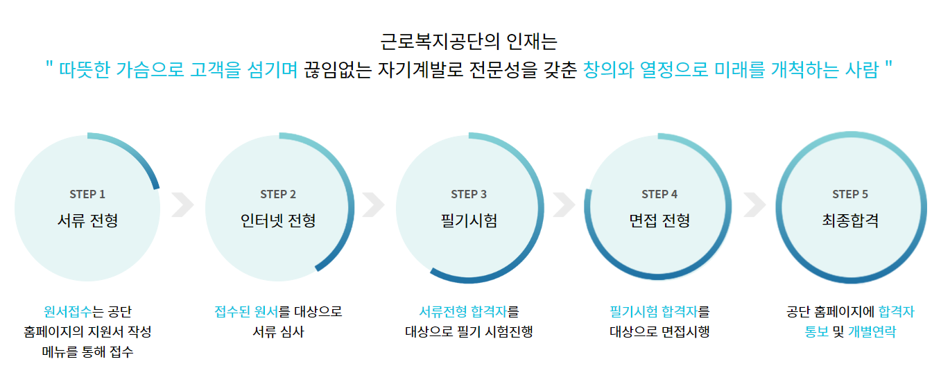 근로복지공단 채용절차는 서류 > 필기 > 면접 순으로 이루어져 있습니다.