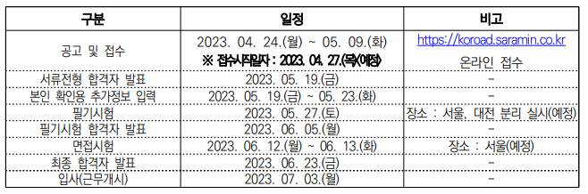 도로교통공단에서 2023년 상반기 신입직원 공개채용을 시작하였습니다.