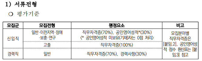 직무자격증과 공인영어성적으로 채용예정인원의 20배수를 선발합니다.