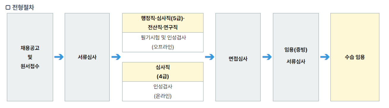 서류 > 필기시험 > 인성검사> 면접 > 수습임용 > 정식임용